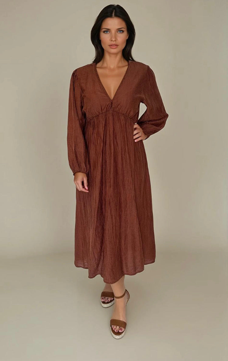 Transition seamlessly between seasons with our ultra-flattering cotton midi dress. Designed with a deep V neckline and full-length sleeves, this relaxed silhouette drapes beautifully on all body types. Made from breathable, textured cotton, it's lightweight yet chic—perfect for layering or wearing on its own.