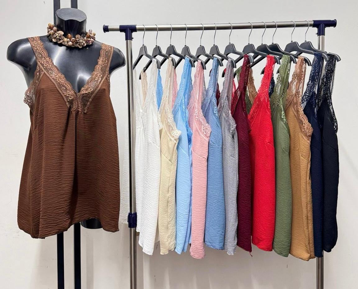 Pretty and versatile to wear any time- longline crepe vest tops with lace detailing and elastic at back for comfort