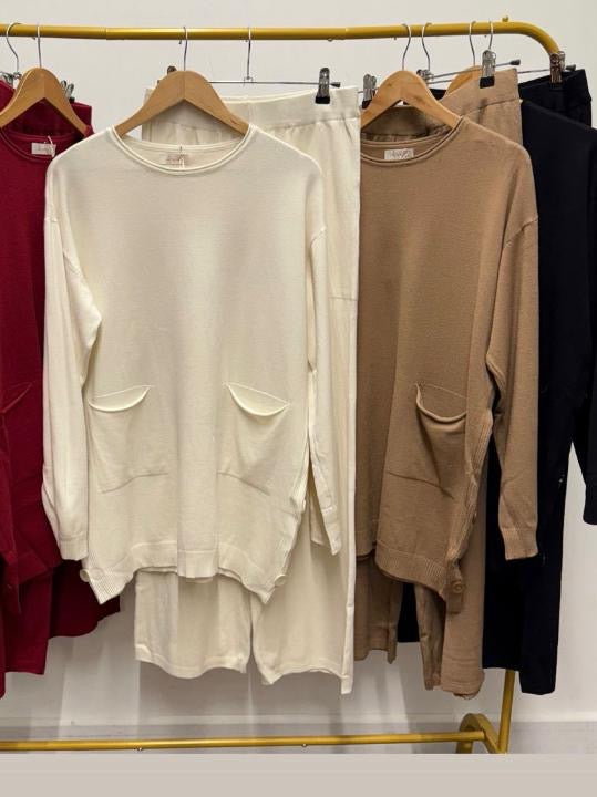 In the softest light wool easy to wear onesize comfy cosy but stylish coord set with oversize jumper with pockets and pull on straight leg trousers